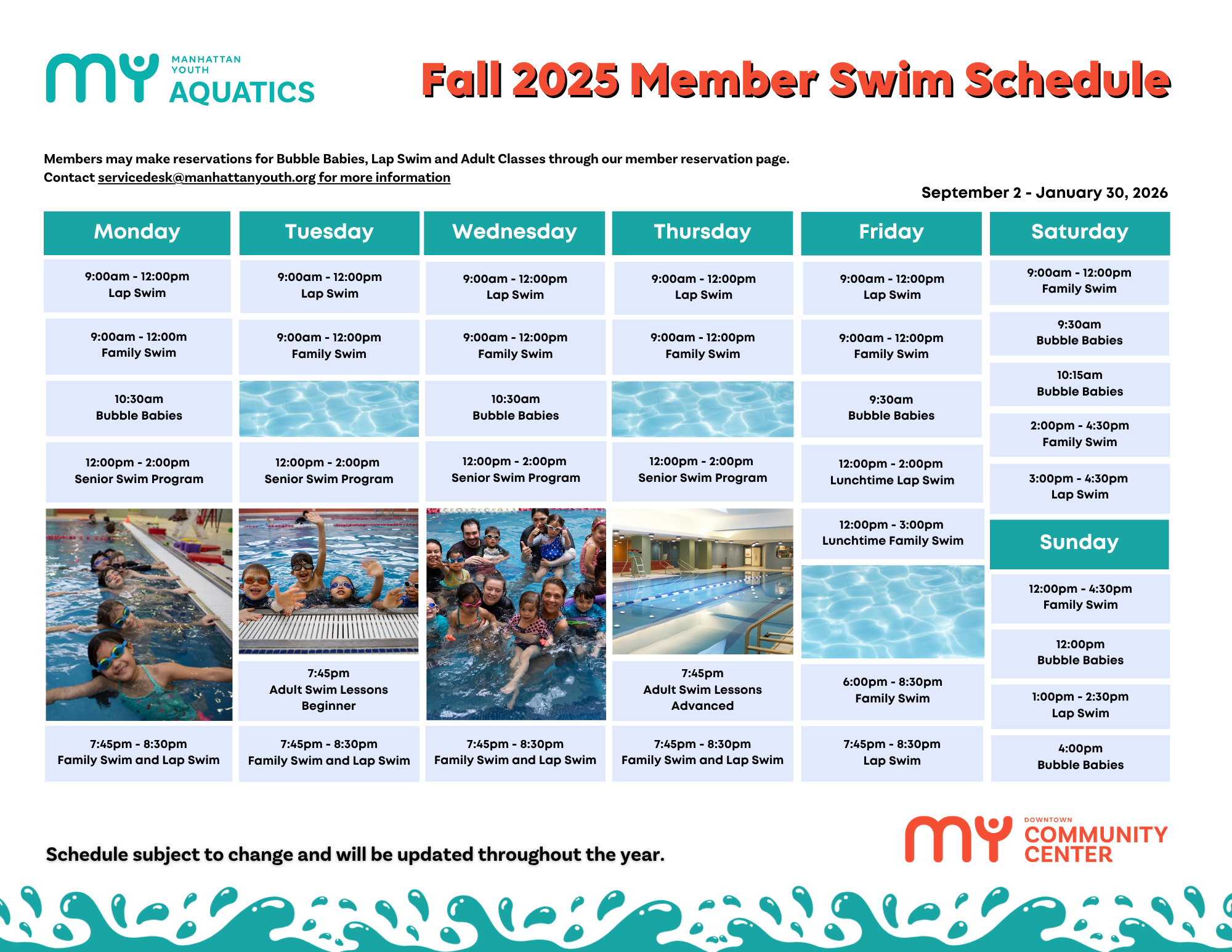 Contact our Aquatics office at 212-766-1104 x298 or e-mail swim@manhattanyouth.org for additional information.